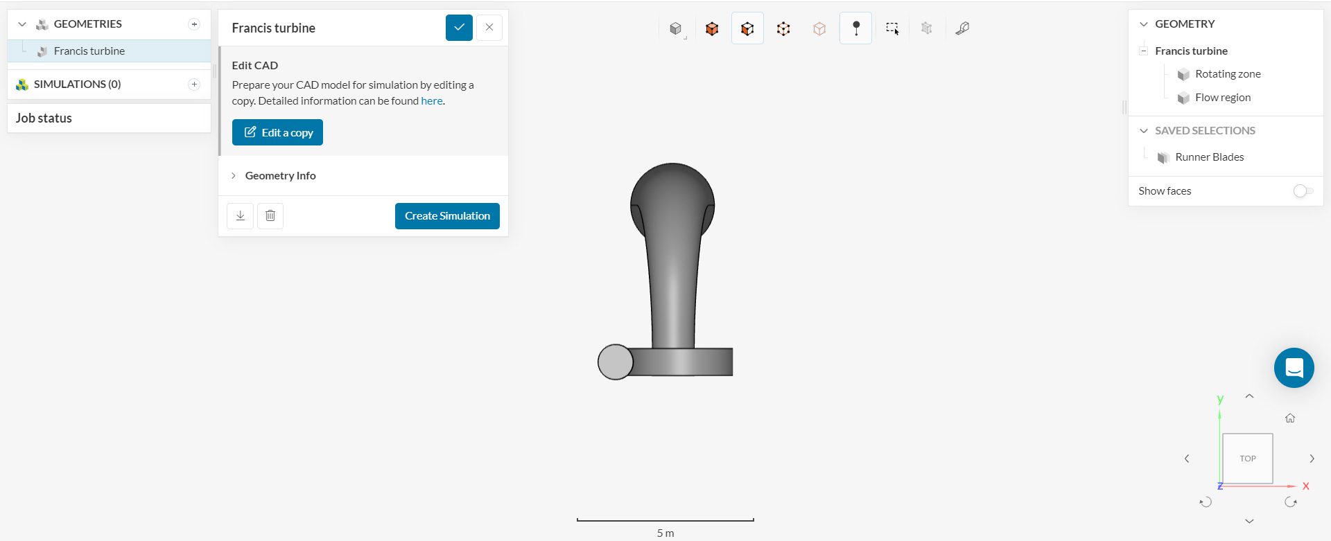 The geometry consists of the flow region of a Francis turbine. Furthermore, there’s also a solid cylinder part named Rotating zone.