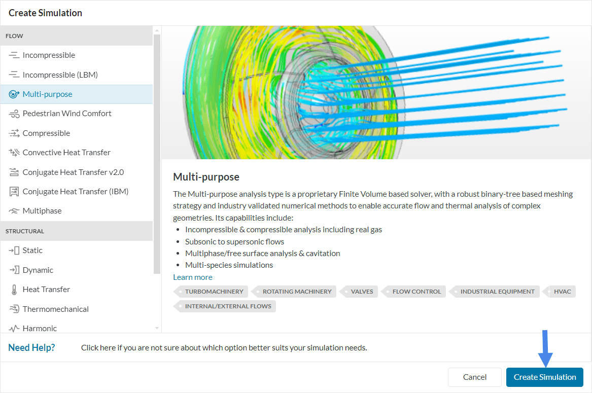 Choose ‘Multi-purpose’ as the analysis type and ‘Create Simulation‘.