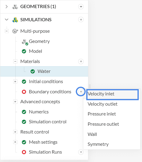 Click on the ‘+ button’ next to boundary conditions. A drop-down menu will appear, where one can choose between different boundary conditions.
