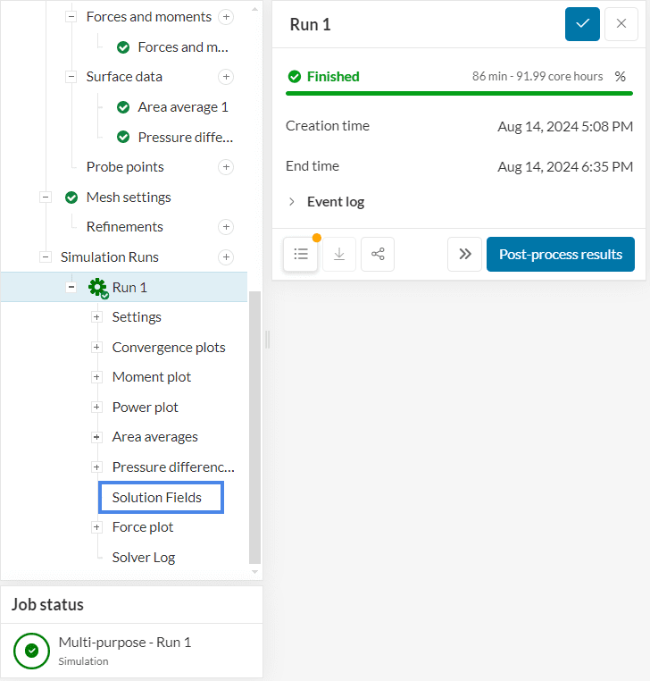 While the results are being calculated, you can already have a look at the intermediate results in the post-processor by clicking on ‘Solution Fields’ or ‘Post-process results’. They are being updated in real-time!