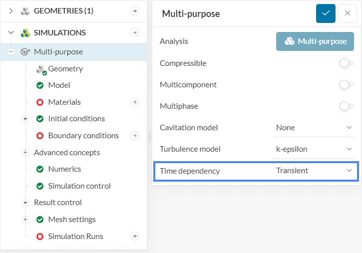 The global simulation settings remain as default, except for the Time dependency which should be changed to Transient as in Figure 5. This is because we are interested in the time-dependent variation of the quantities involved in flow physics. This also means that we will be dealing with sliding mesh for the rotating zone region.
