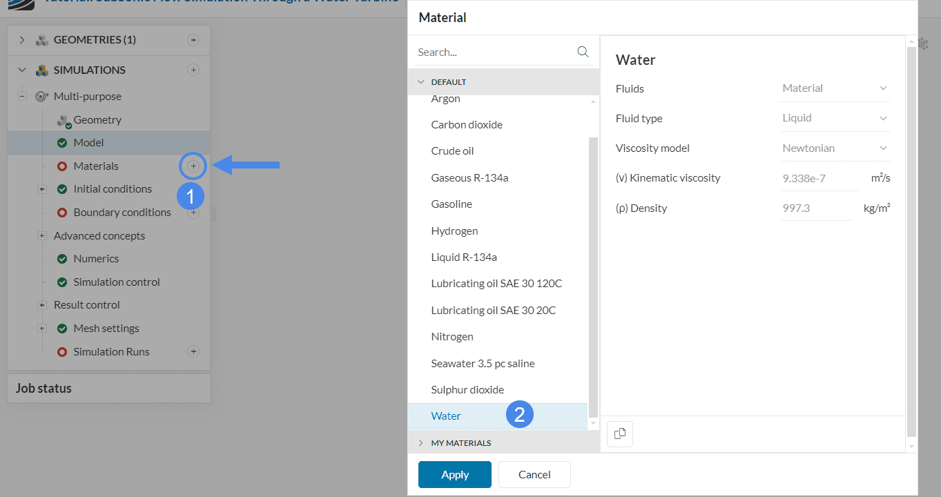 This simulation will use water as a material. Therefore click on the ‘+ button’ next to Materials . In doing so, the SimScale fluid material library opens, as shown in the figure below:
