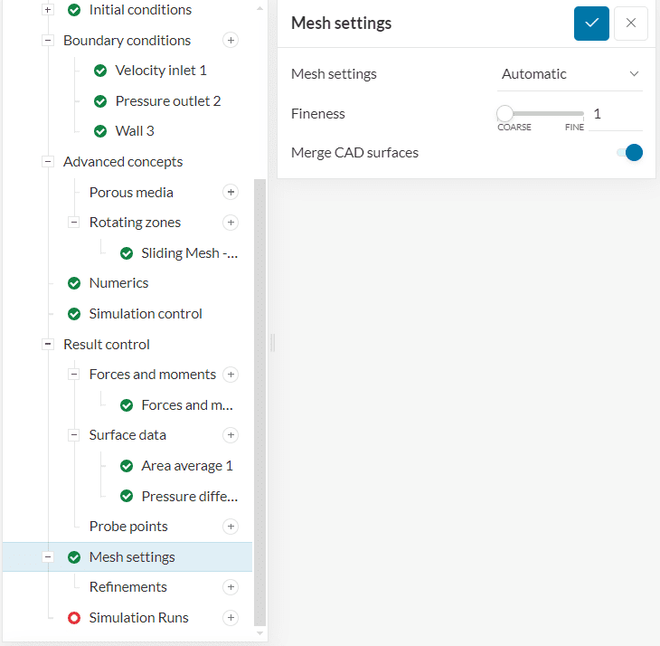 In this tutorial, a mesh fineness level of 1 will be used. If you wish to undertake a mesh refinement study, you can increase the fineness of the mesh by sliding the mesh to higher refinement levels or using the region refinements.