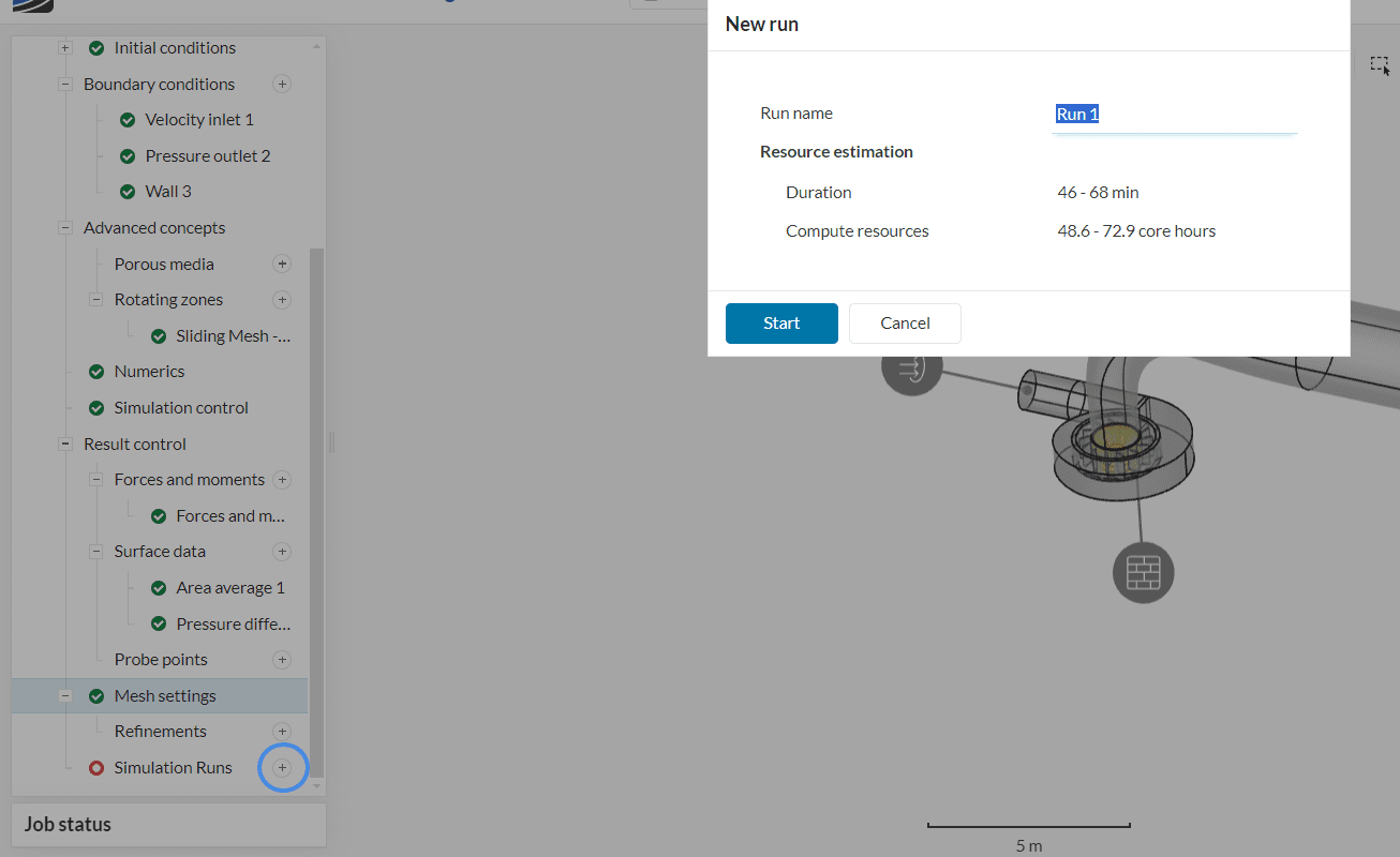 Now you can start the simulation. Click on the ‘+’ icon next to Simulation runs. This opens up a dialogue box where you can name your run and ‘Start’ the simulation.