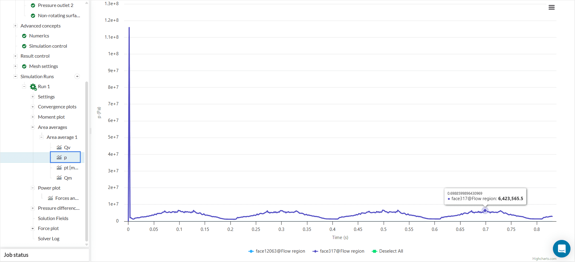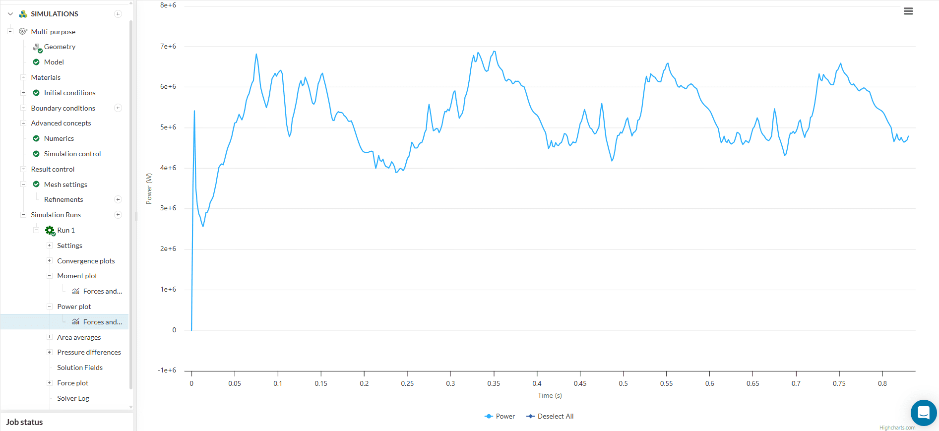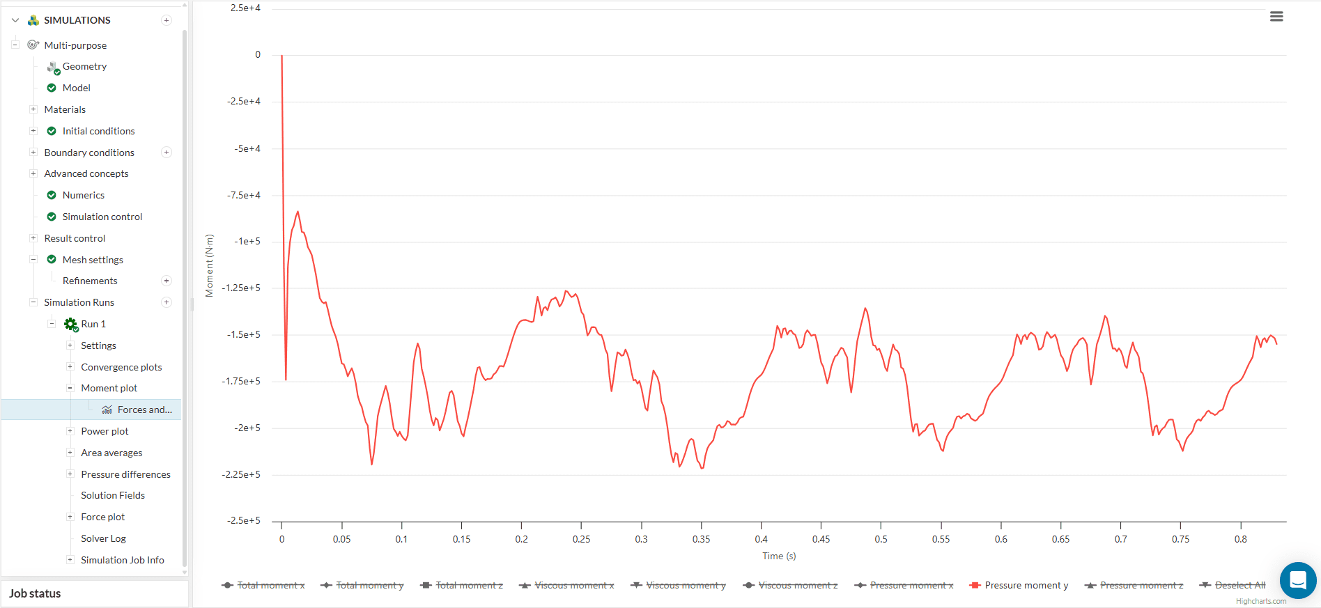 The Forces and moments results are of particular interest in a simulation with a turbine. The runner of our turbine was rotating around the y-axis. Hence, let’s inspect the resulting pressure forces and the torque generated around said axis: