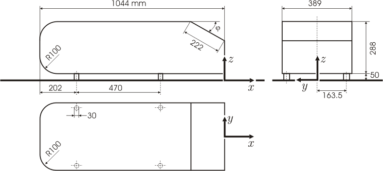 The geometry is created based on the simplified aerodynamic body used by Ahmed et al\(^1\). See Figure 1 for dimensions and Figure 2 for the geometry. The slant angle (\(\phi\)) is set to 25°. The body is placed in a wind tunnel 6 \(m\) x 5 \(m\) x 13.5 \(m\) in order to limit the aerodynamic blockage effect.
