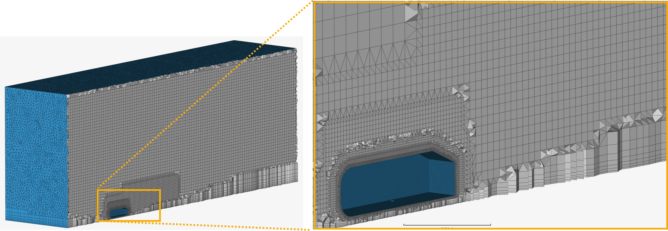 The Standard Mesher algorithm with tetrahedral and hexahedral cells was used to generate the mesh, with refinements near the walls and in the wake region (see Figure 3).