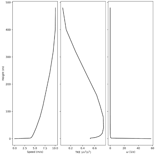 Regarding the ABL wind profile, a power law approximation was applied, as is the default for the SimScale Pedestrian Wind Comfort (PWC) approach. The figure below illustrates the log-law ABL profiles for velocity and turbulent quantities generated by SimScale.