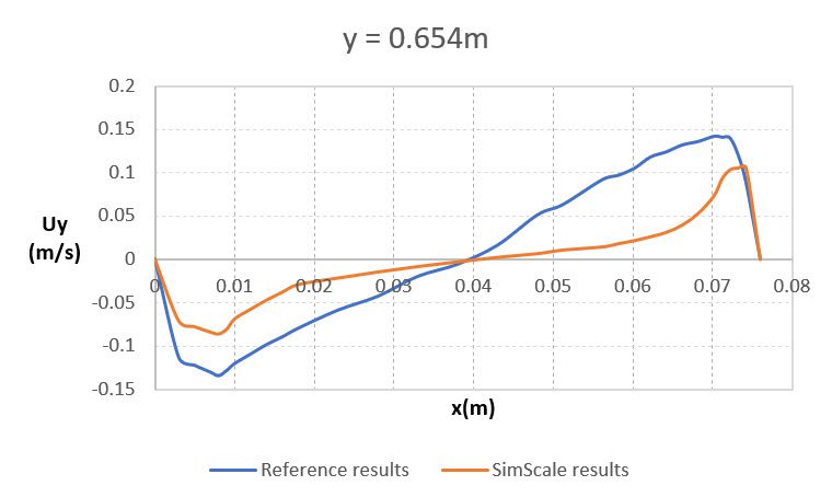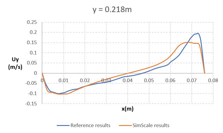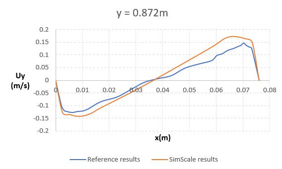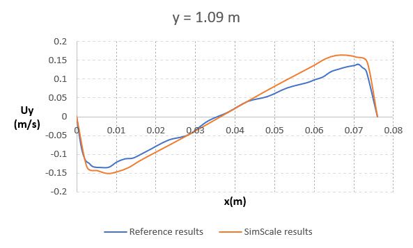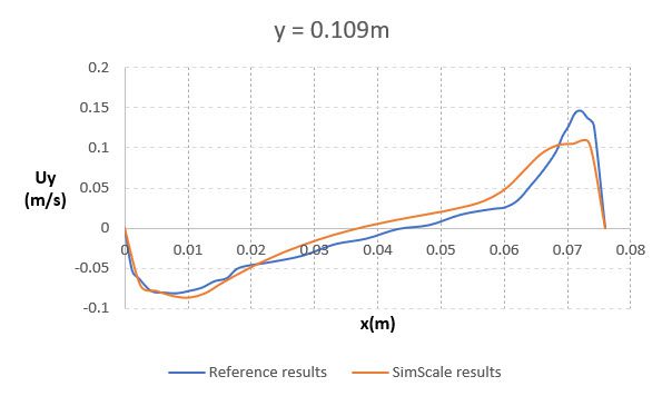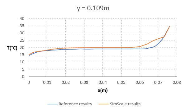 Shown below is the comparison of the temperature profile between the two plates obtained from SimScale simulation results with the reference paper \(^1\) at a height of 0.109 \(m\) . The reference line is located at the mid-plane normal to the z-direction: