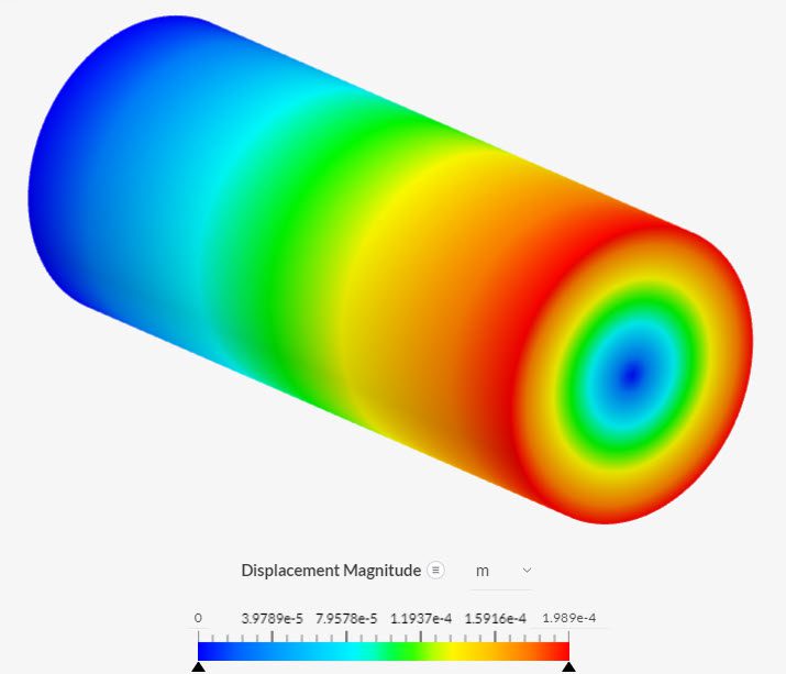 For both 1st order and 2nd order meshes, the results show good agreement with the analytical solution. Find below an image showing the displacement magnitude on the cylinder, for case B: