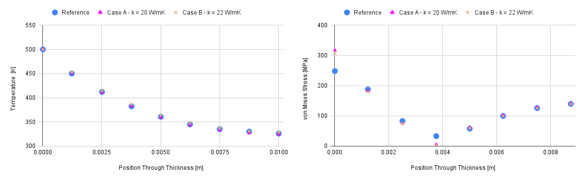 Since no value for thermal conductivity \(\kappa\) was provided, the values of 20 \(\frac {W}{m.K}\) and 22 \(\frac {W}{m.K}\) were used. For the final time step, the SimScale results for von Mises stress \([MPa]\) and temperature \([K]\) over the edge EF are compared to those from [Afkar]\(^1\).