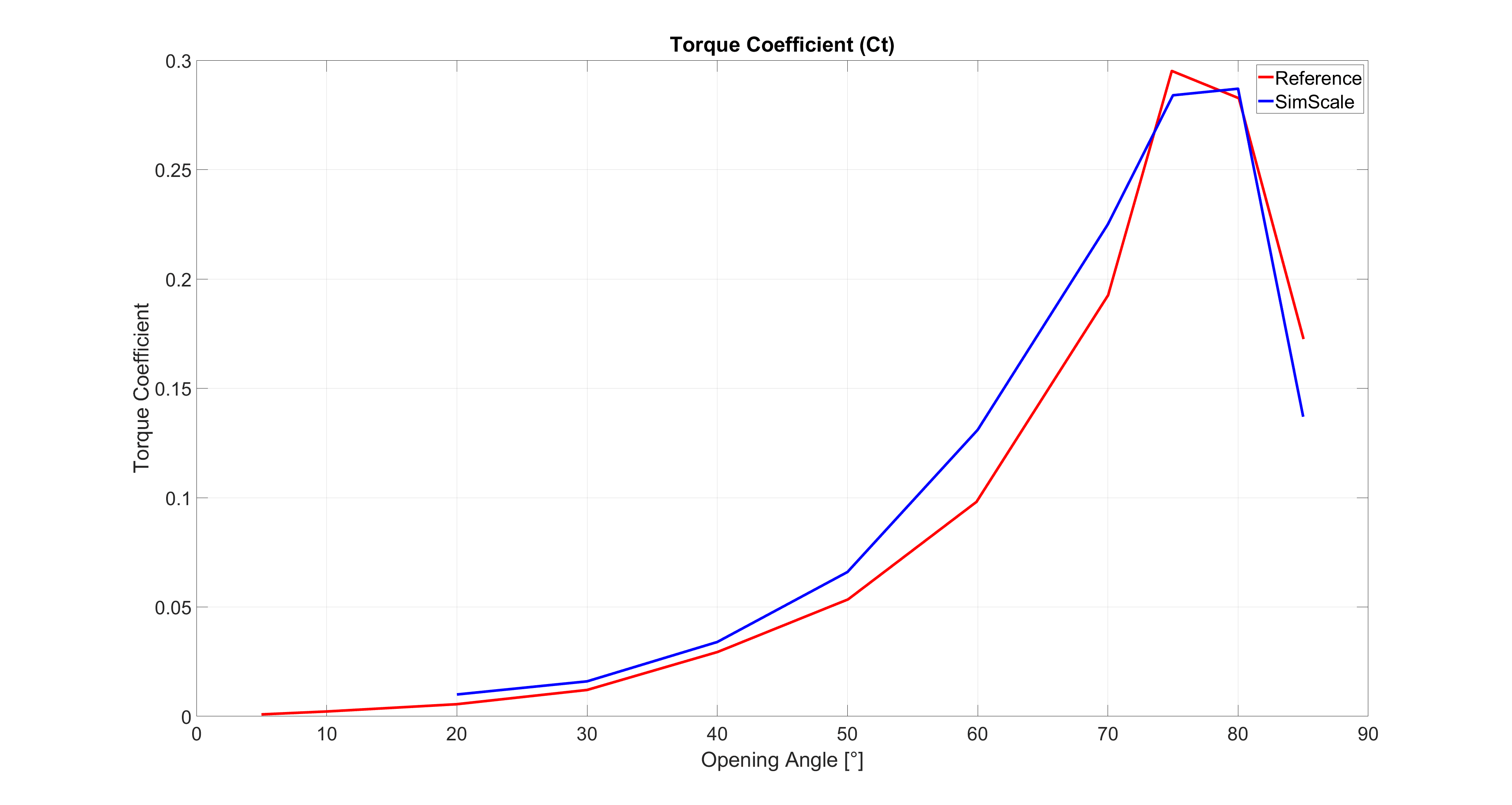 The simulation results of SimScale were compared to the results presented in the study done by Song, Xue Guan and Park, Young Chui with the title “Numerical Analysis of Butterfly Valve – Prediction of Flow Coefficient and Hydrodynamic Torque Coefficient“\(^1\).