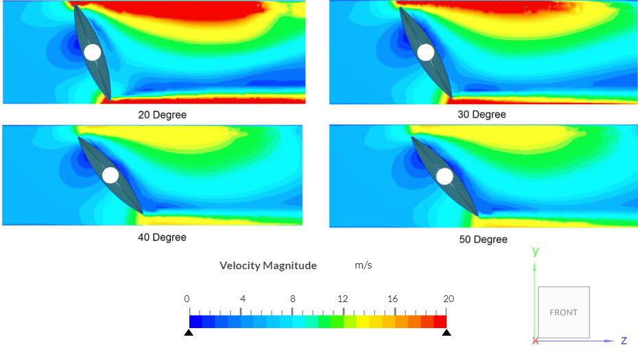 The flow contours inside the pipe when the valve is opened at the simulated opening angles as observed in our online post-processor: