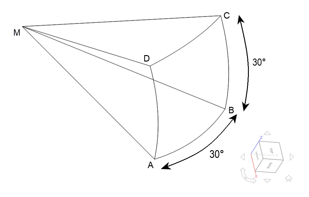 Only a portion of a sphere with a diameter of 0.2 \(m\) is used for the analysis, as shown in the figure below. M is the center of the sphere and the face ABCD represents the outer surface.