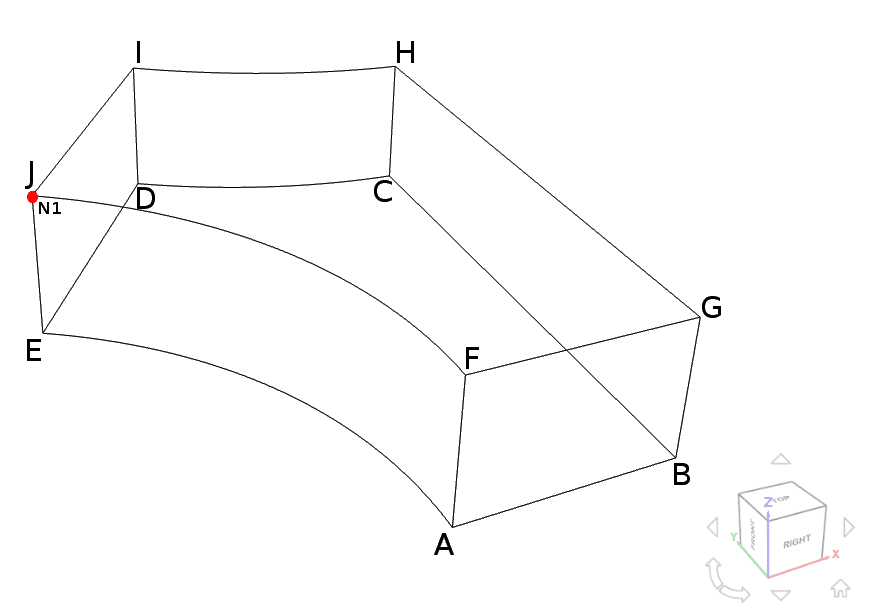 The geometry used for the analysis with the highlighted node N1 can be seen below. It is a random thick plate with straight and curved edges.