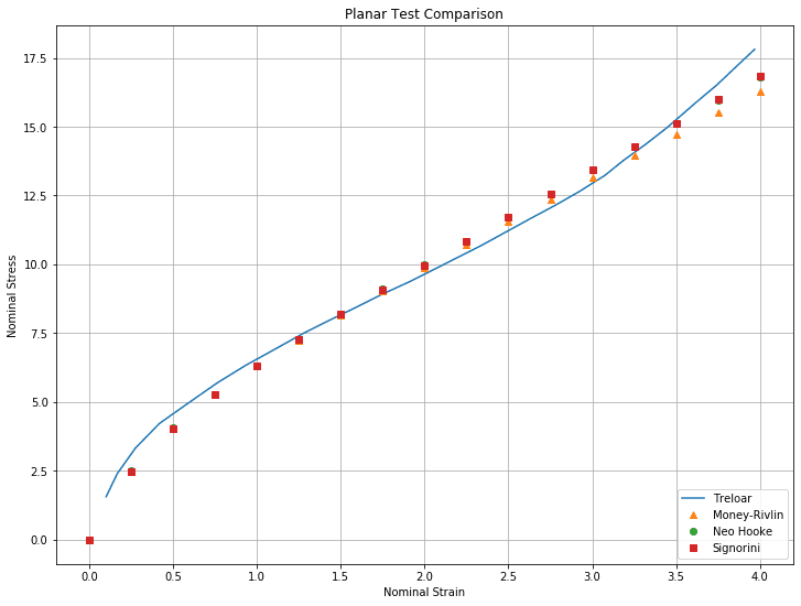 Comparison of the nominal stress-strain curves computed from reaction forces on the faces with zero displacements, versus the reference data is shown in Figure 3: