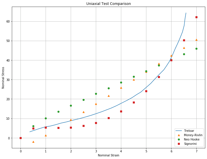 Comparison of the nominal stress-strain curves computed from reaction force on the faces with zero displacement, versus the reference data is shown in Figure 3: