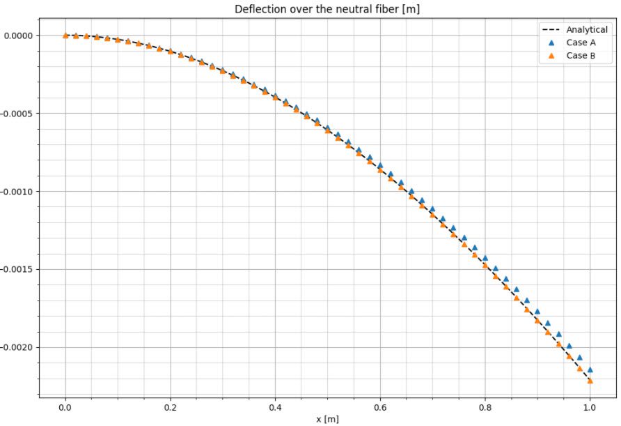 The analytical solutions for the deflection \(w\) at the free end of the beam are given by the following equations. The remote force \(F\) is substituted with a force and moment pair \(M\):