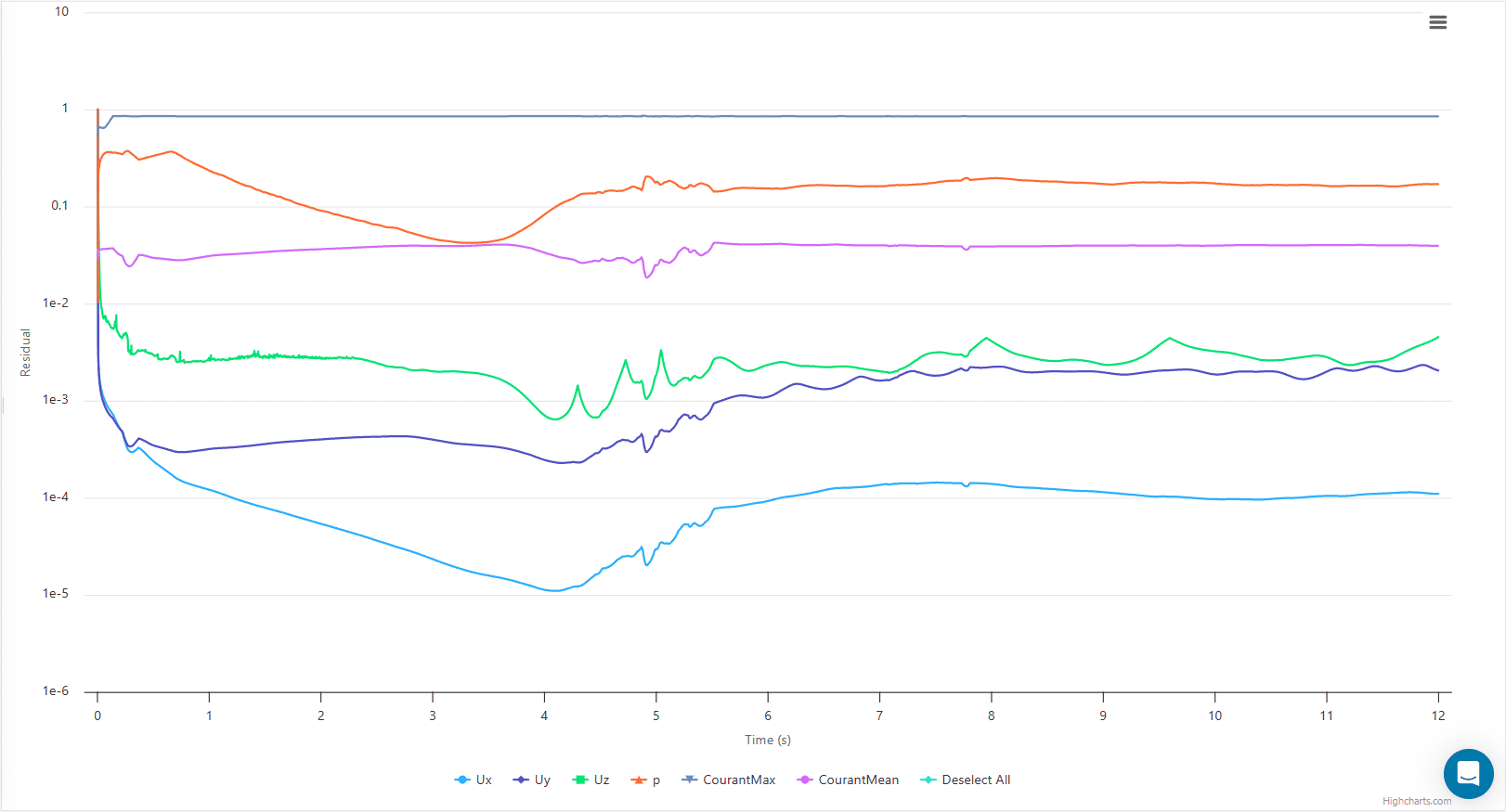 The convergence plots seem to find an acceptable stability after 7 seconds. Since this is a transient simulation with eddies resolved, it was important to find the mean value of the comparing variables over the final few time steps (8-12 seconds).