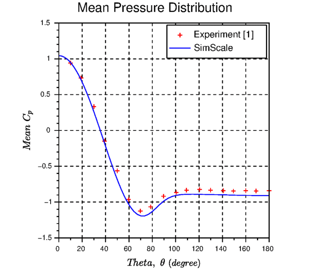 A comparison of the mean pressure distribution obtained with SimScale and experimental data provided by C.Norberg\(^1\) is given in Figure 5.