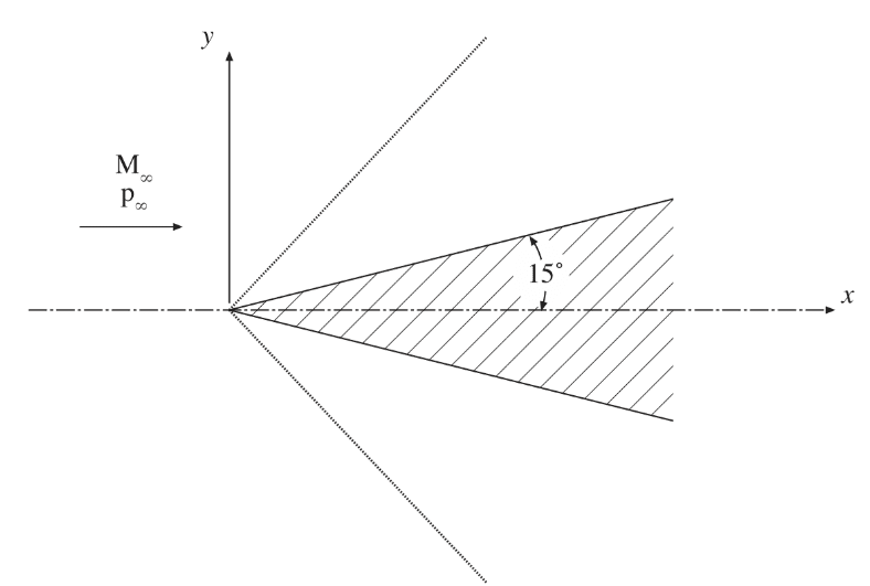 The aim of this validation is to compare the simulation results performed in SimScale using the compressible flow feature in its proprietary solver, Multi-purpose, with the simulation results in the study done by NASA titled, “Mach 2.0 Flow Over a 15 Degree Wedge\(^1\)” as well as the analytical results \(^2\).