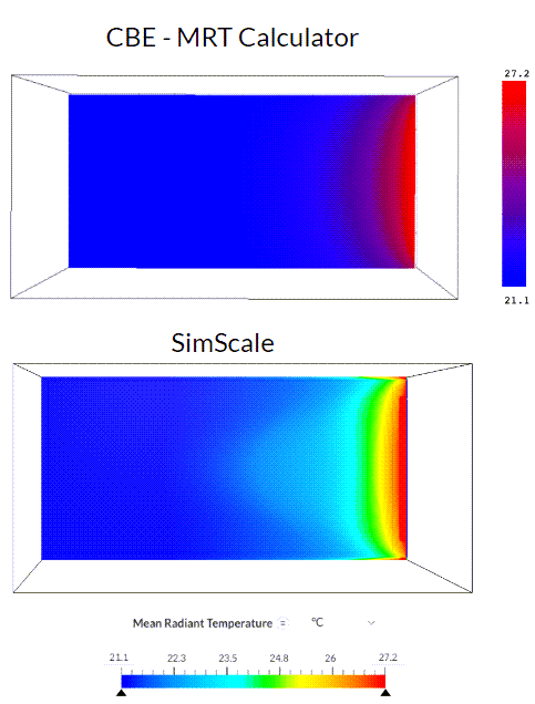 The simulation results from SimScale were compared to an online Web tool from ASHRAE for MRT & Thermal comfort: CBE MRT Calculator
