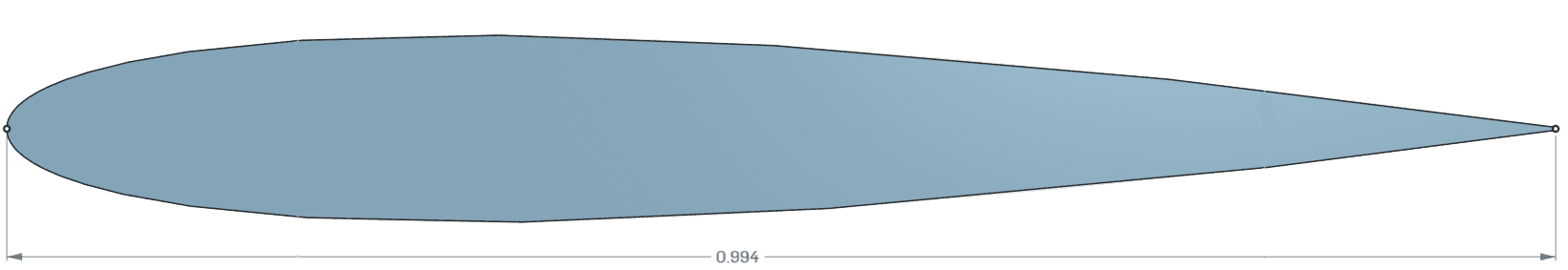 The NACA 0012 is a symmetric, 4-digit airfoil characterized by a maximum thickness of 12% of the chord, with no camber. The geometry is defined analytically, making it highly suitable for numerical studies due to its smooth and well-behaved surface profile\(^1\). In this case, the chord length is set to ≈1.0 \(m\), which is consistent with the reference.