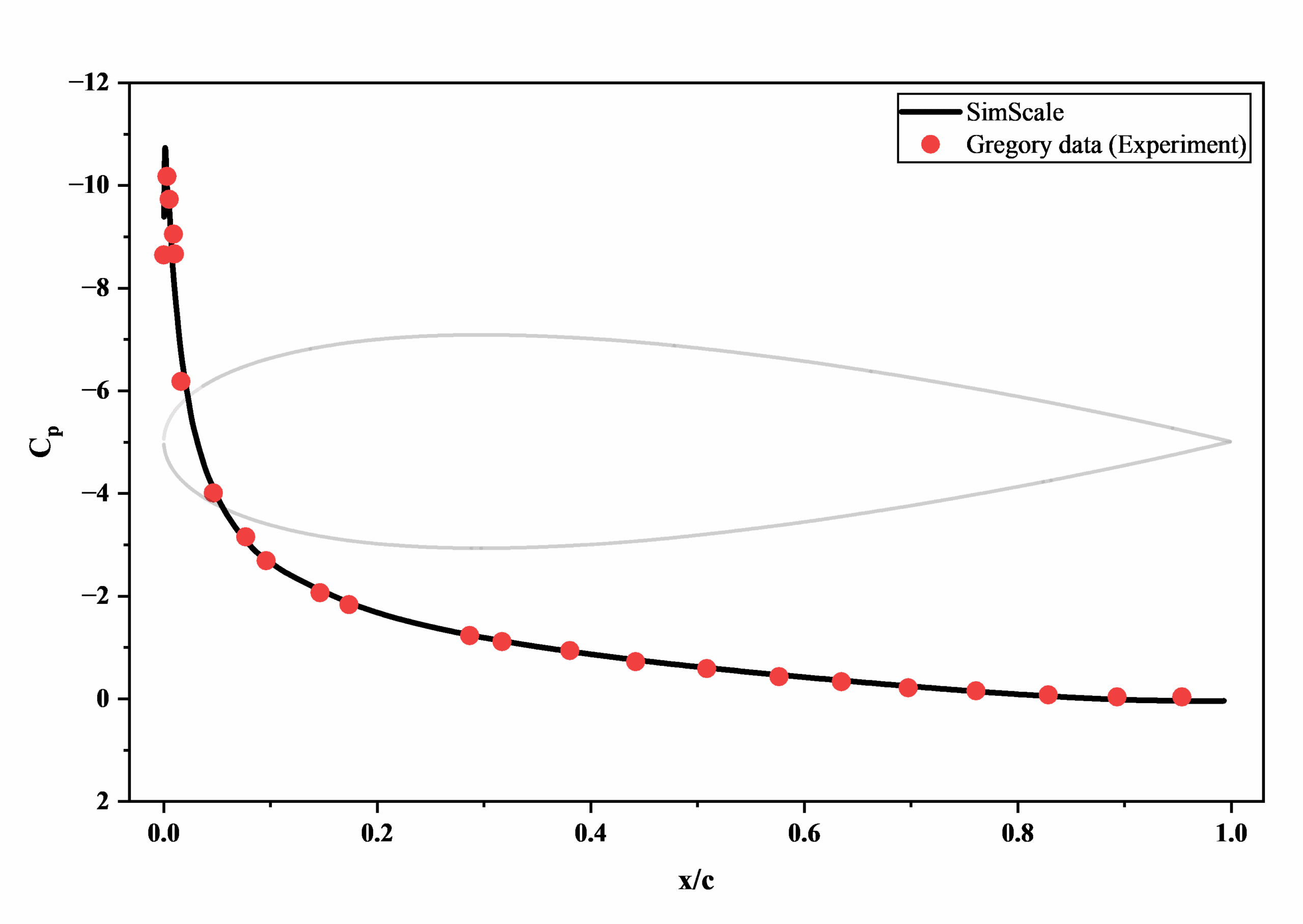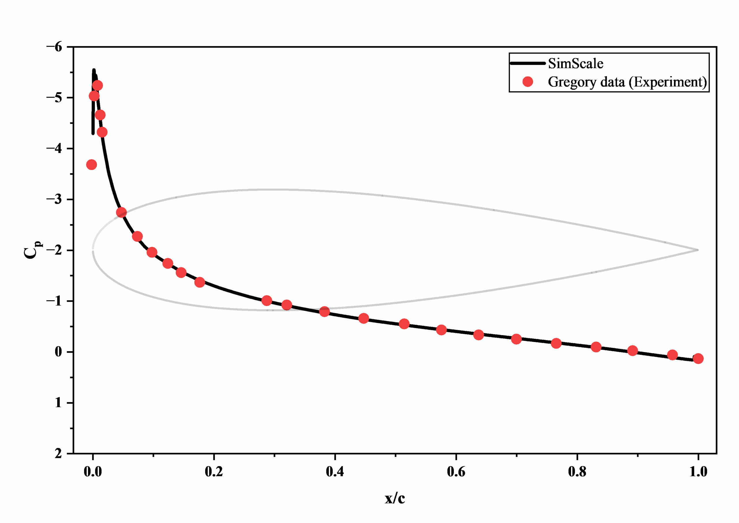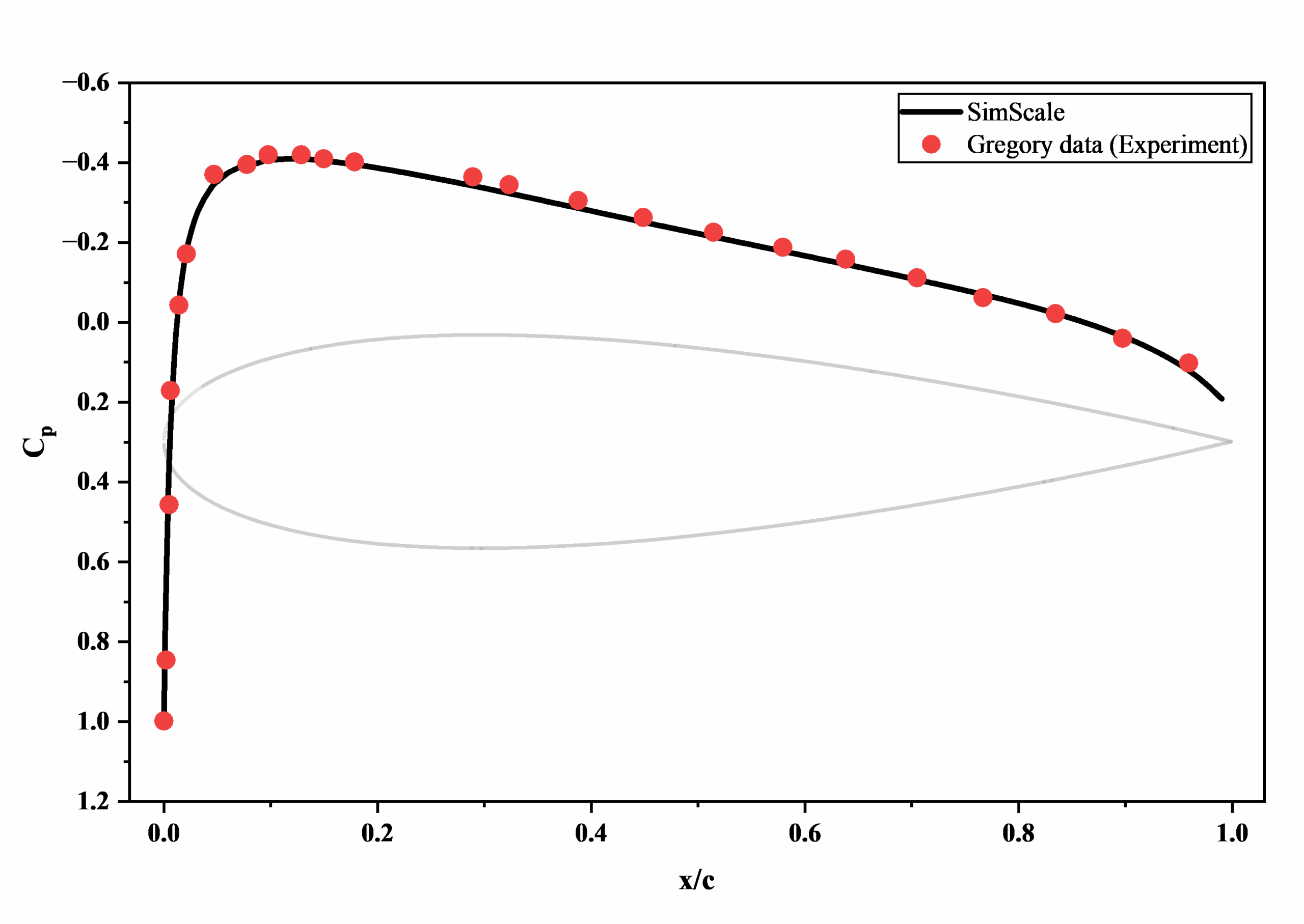 SimScale provides a built-in result control feature for calculating force and moment coefficients, allowing users to define the directions of lift and drag, as well as specify the reference length and reference area. For this validation case, the experimental lift and drag coefficient data were obtained from Ladson\(^2\), while the pressure coefficient data were taken from Gregory\(^3\).