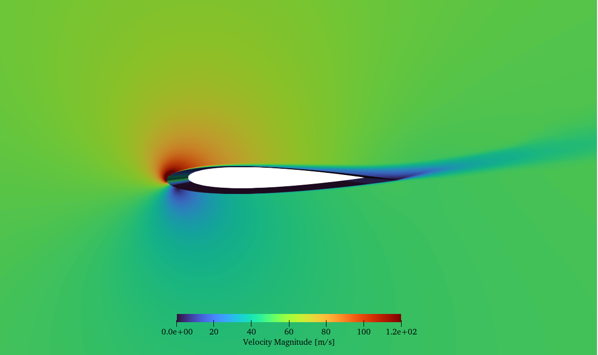 Figure 8 shows the velocity contours for the NACA 0012, considering an AoA of 15°. The contour shows the flow pattern, where we can see the boundary layer near the airfoil wall.