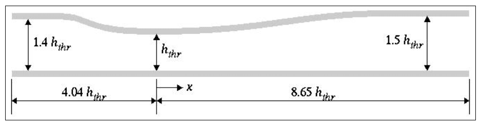This configuration has an entrance to throat area ratio of 1.4, and an exit to throat area ratio of 1.5. From the entrance, the throat is located at 4.04 times the throat height (\(h_{thr}\)) of 0.044 \(m\).