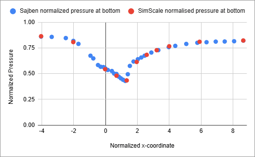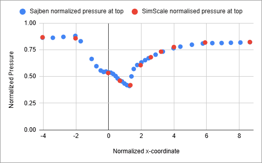 Using the probe point feature in SimScale, the static pressure was measured at the top and bottom surface profile of the diffuser and compared against the study\(^1\). The static pressure values are normalized using the total absolute pressure at the inlet.