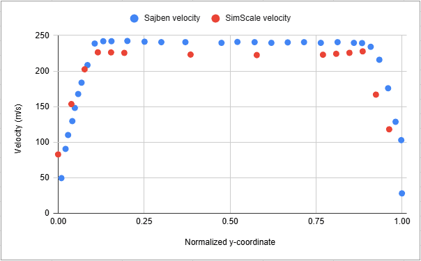 SimScale results were compared against three plots from the NASA experimental study\(^1\): Pressure ratio along the top and bottom surface against the normalized x-coordinate of the profile, and the flow velocity profile at an axial location within the diffuser.