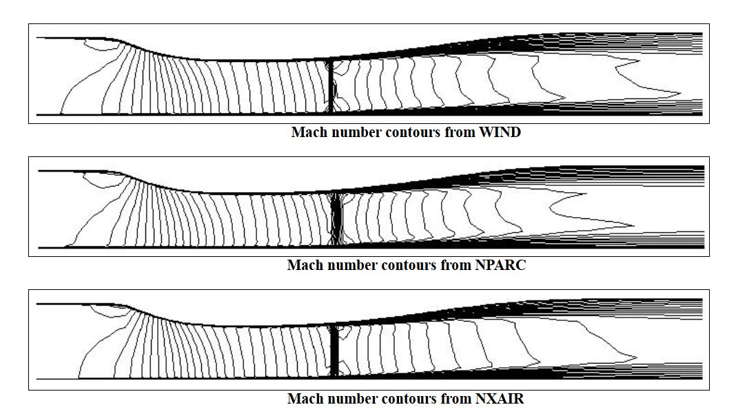 Additionally, Mach number contours for three codes WIND, NPARC, and NXAIR are computed in the study\(^1\). The WIND and NXAIR results show a well-defined normal shock than the NPARC results. The NXAIR shock position is slightly downstream of the position predicted by the other two codes. WIND and NPARC predict similar boundary layer growth downstream of the normal shock, while NXAIR predicts a thinner boundary layer.