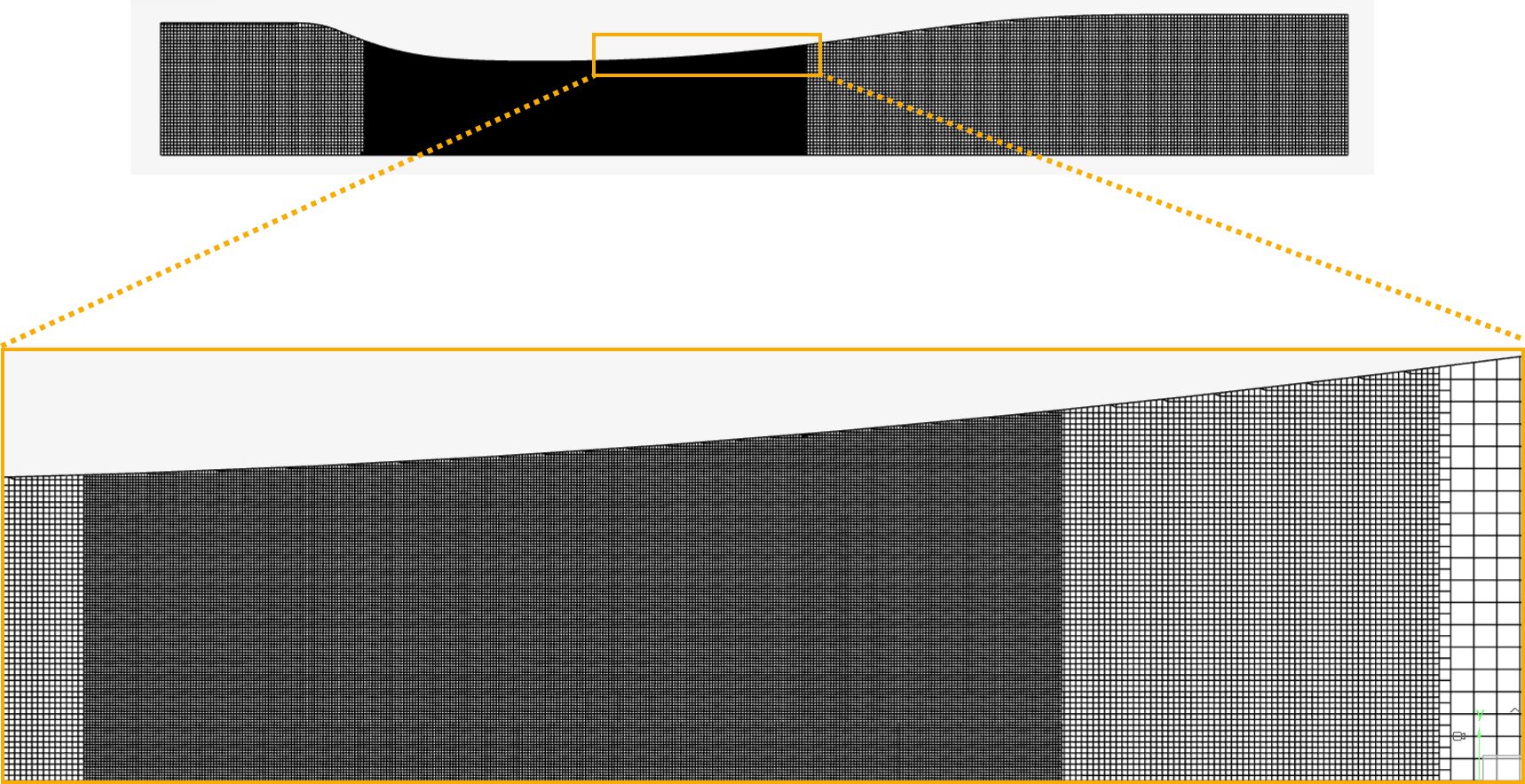 The exact geometry profile was used to create a Sajben Difusser CAD model and imported into SimScale. It has a tiny thickness to represent a two-dimensional flow.