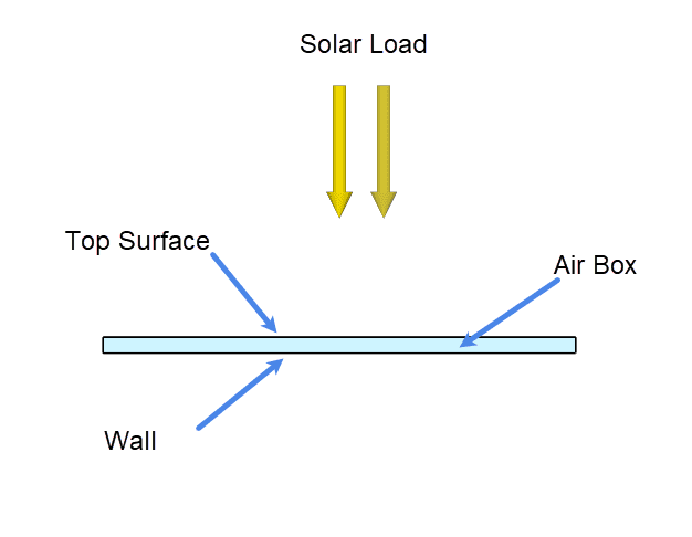 The top surface has a fixed temperature and the side walls are set adiabatically. The bottom surface is the wall for which the temperature is to be calculated and compared. The solar load is applied in the normal direction of the wall.