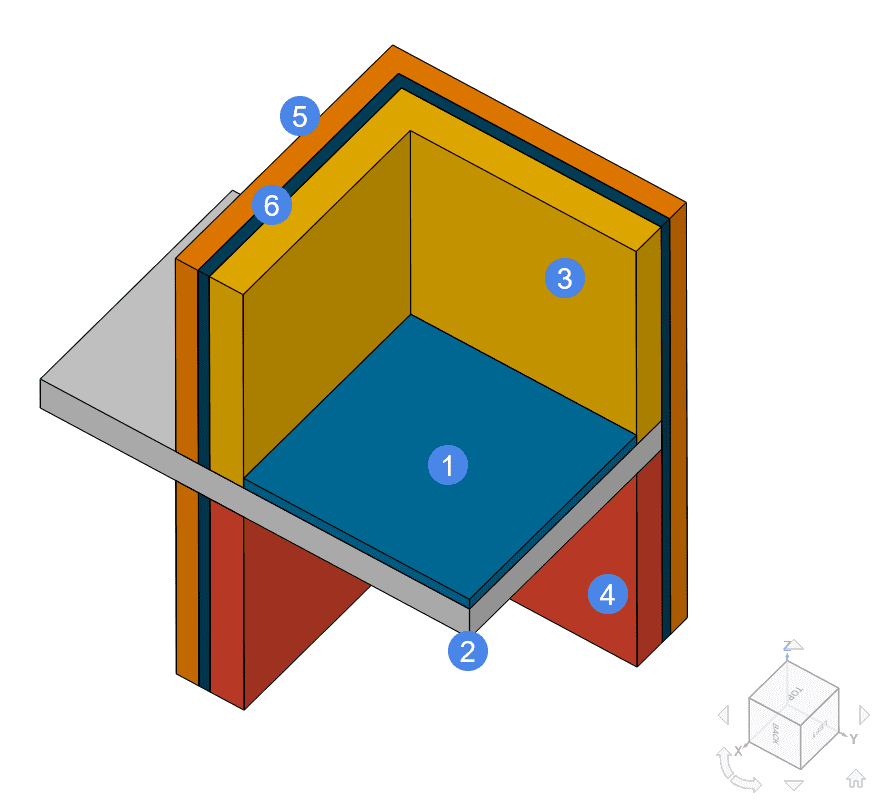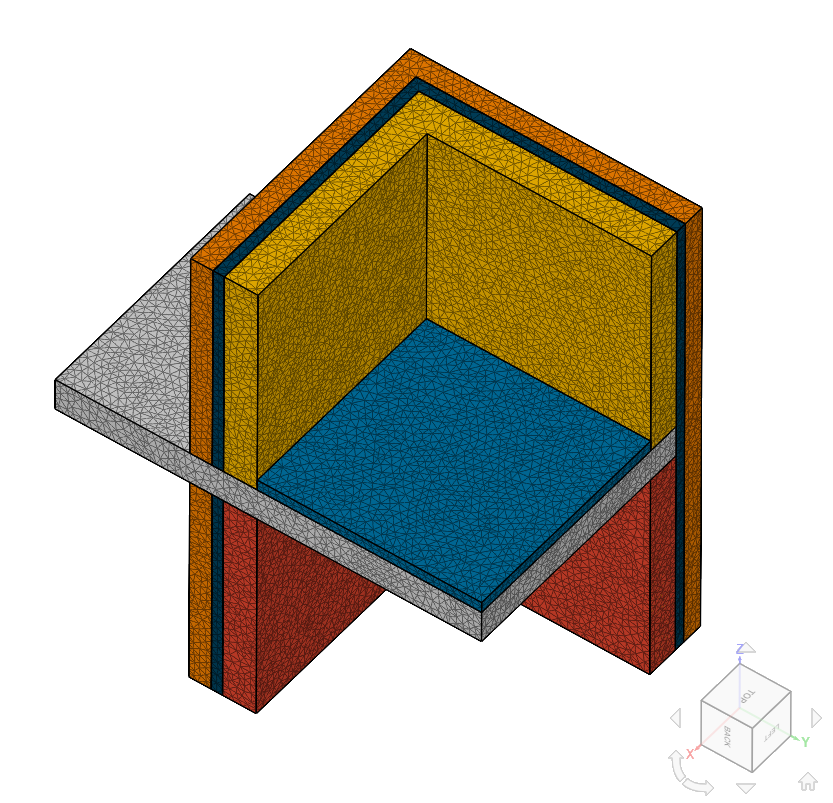 The model considers convective heat transfer from the surfaces of the structure to the corresponding spaces. The interior spaces are at 20\(°C\) and 15\(°C\), and the exterior is at 0\(°C\). Also, the standard specifies the heat transfer properties in terms of the thermal resistance \(R\), which must be converted to the heat transfer coefficient used in SimScale, according to: