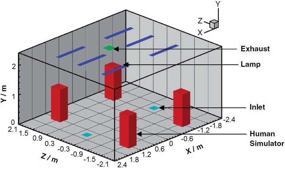 Cool air is fed to the room through the inlets on the floor, while the humans and the lamps heat the surrounding air, creating convection currents. Figure 1 gives an overview of the geometry and room dimensions.