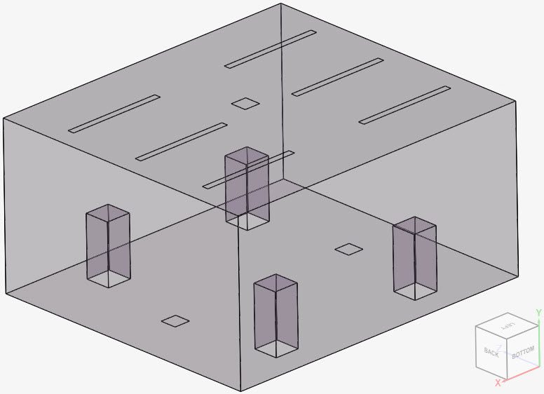 The geometry consists of a room with an underfloor air distribution (UFAD) ventilation system. The heat sources used are four human simulators and six ceiling lights.