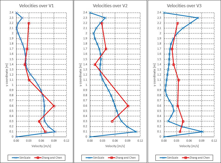 The lines of interest for this validation case were V1, V2, and V3. Find the comparison between the reference study and the SimScale results for velocity in Figure 6: