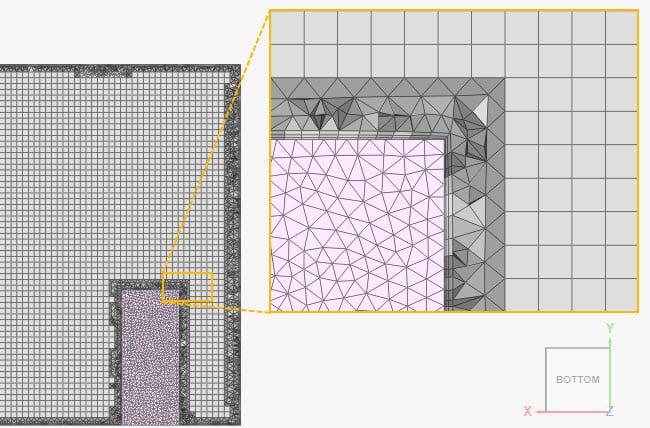 Using a mesh clip to inspect the interior cells, it’s possible to observe the transition from tetrahedral cells to hexahedral cells. The boundary layers are also visible: