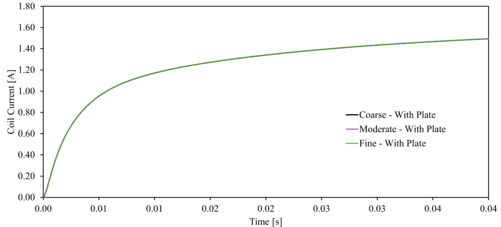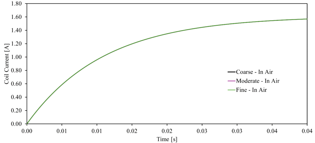 A mesh sensitivity study was performed with a set of three meshes (Table 1 and 2), focusing on the current observed on the coil. Figures 4 and 5 show how the current evolves as more nodes are added to the mesh: