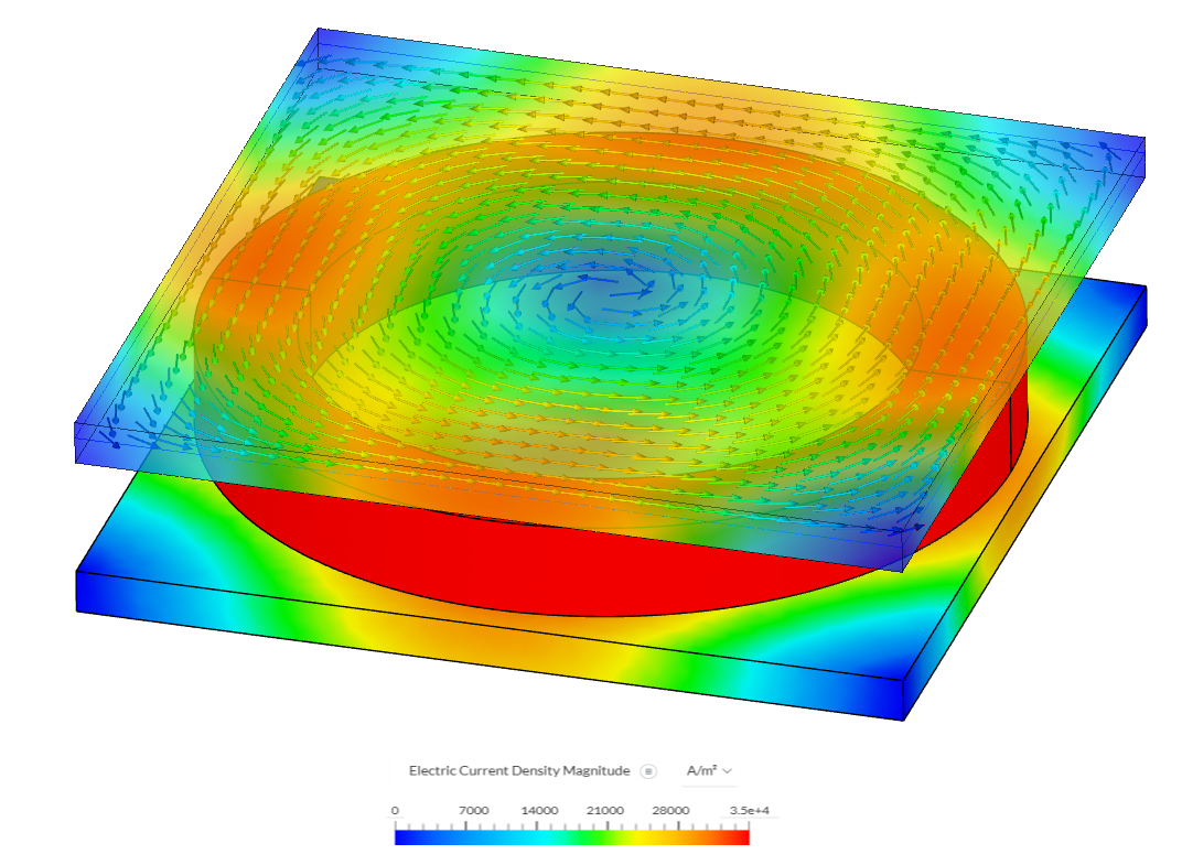 Figure 7 shows the current density in the plate with vectors to visualize the behavior of this variable inside the plate.