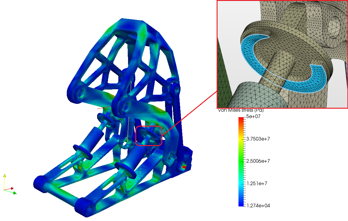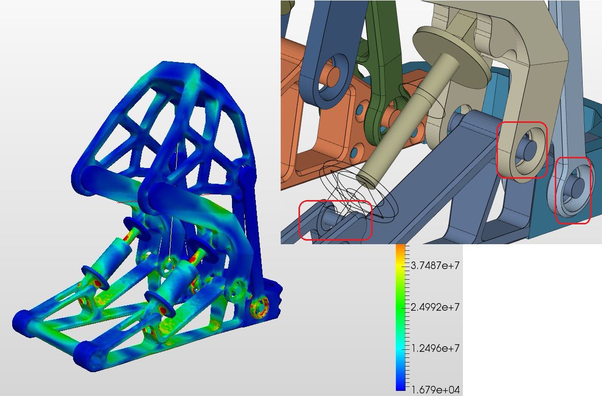 And I’m comparing it to another assembly where pivot shafts are mimicked by extruded cylinders to provide surface that is against the mating hole surface (that was at time when I thought the two surfaces in SimScale Contact must be have their normals against each other). And this version gives quite different stress distribution