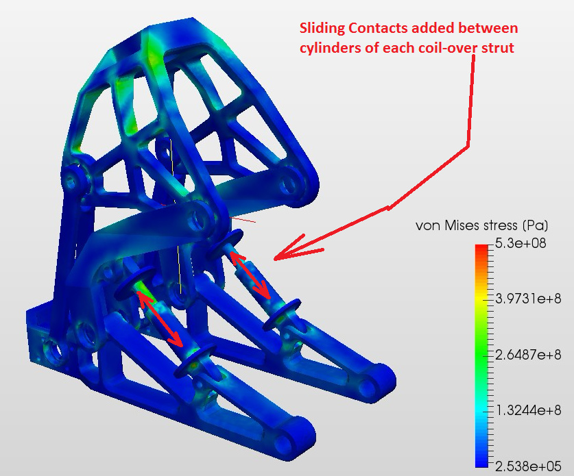 With the Sliding Contacts added into coil-over struts, the assembly is much less stressed and there are less stress peaks.