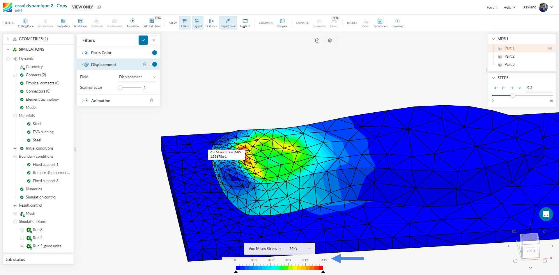 When i look at the results of the simulation “Run 6”, i don’t understand why I can’t see the “Von Mises stress” (and any other physical quantities) on the solid “Part 3” (the one that looks like a sole).