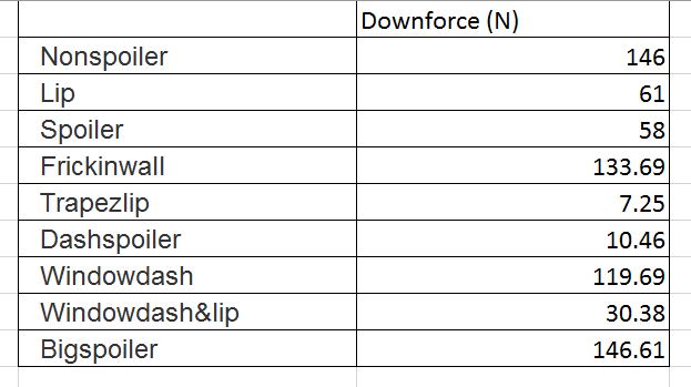 At this point, if I’m about to believe in lift values it seems like lip spoiler more likely helps push body towards ground making it more stable at high velocities. But I’m still curious about drag changes just for sake of clarity of results.