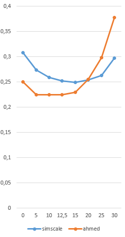 25° slant: 0.326 (error +9 %) (almost exactly the same as in the Validation Case, therefore I assume the VC to be validated within my simulation setup now)