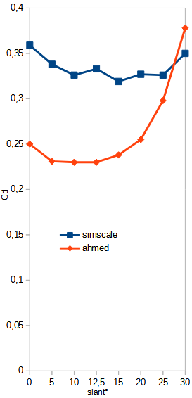 In the project I used AB’s with 12.5°, 25° and 30° slants. Using the original study by Ahmed, we would expect Drag Coefficient values of 0.231, 0.298 and 0.378 respectively.