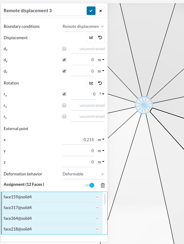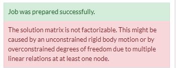 To realize this, I added a symmetry condition (which constraints X-displacement - and implicitly also rotations around Y and Z). To constrain the remaining 3 rigid body movements, I added a deformable remote displacement at the nose which constraints Y- and Z-movement as well as X-rotation.