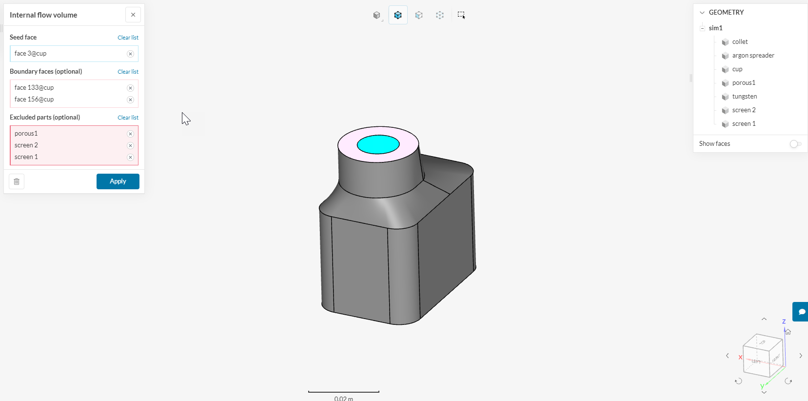 So I extended the bottom face to include the tungsten tip. And then excluded screens 1,2 and the porous plate.